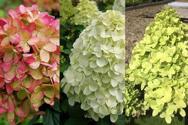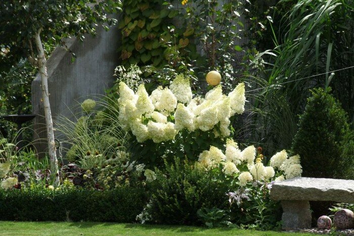 - «Pee Gee» (Гортензия метельчатая «Grandiflora») – округлые метелки из преимущественно стерильных цветков. Крупный куст, часто выращиваемое в форме дерева.